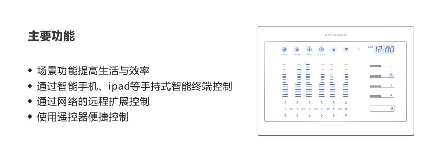 ● 感性照明控制(卧室,客厅) ● 通过调控光影变化呈现出舒适的照明场景效果 ● 时尚的设计,提升居住环境的品位 ● 多种照明场景转换,营造出多样空间氛围 ● 连接家庭网络,便捷扩展控制