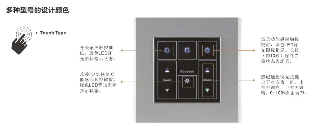 网络调光开关(1路、2路、4路、6路) ● 感性照明控制(卧室,客厅) ● 通过调控光影变化呈现出舒适的照明场景效果 ● 时尚的设计,提升居住环境的品位 ● 多种照明场景转换,营造出多样空间氛围 ● 连接家庭网络,便捷扩展控制