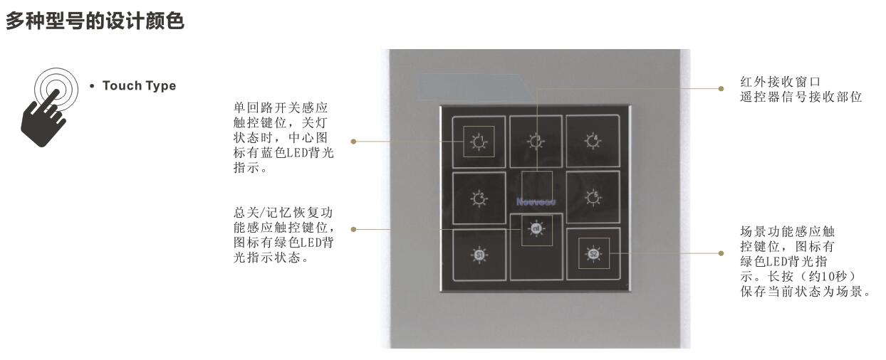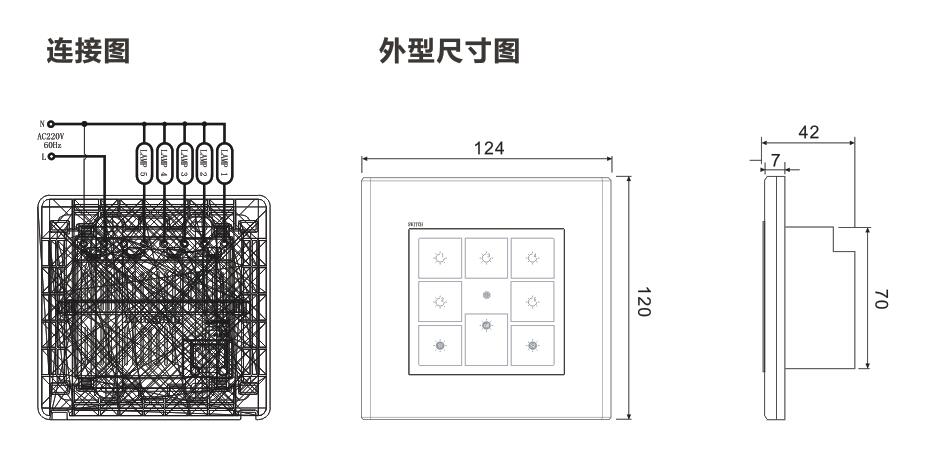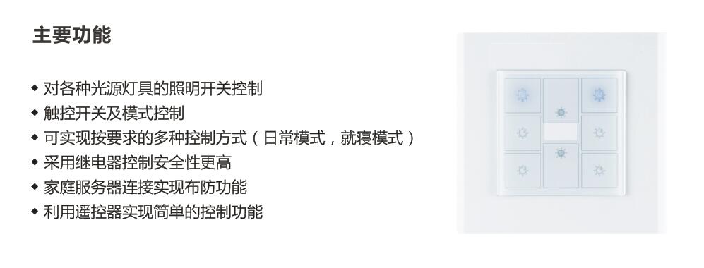 网络开关(3路、4路、5路、6路、7路) ● 点灭灯与模式控制功能 ● 时尚的设计提升居住环境的品位 ● 使用遥控器便捷控制 通过网络的外部控制 日常、就寝等模式控制 模式开关功能(ALL\ON\OFF)