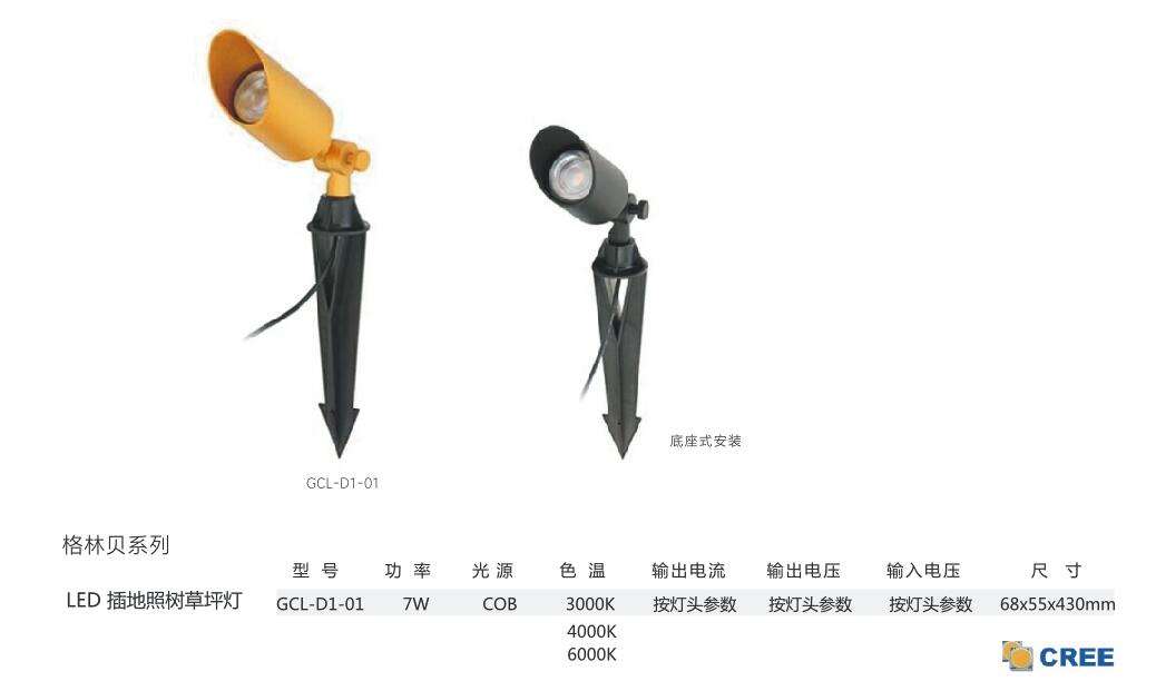 | GCL-D1-01 | 7W | CREE | 按灯头参数 | 3000K/4000K/6000K | 按灯头参数 | 按灯头参数 | 68x55x430mm |