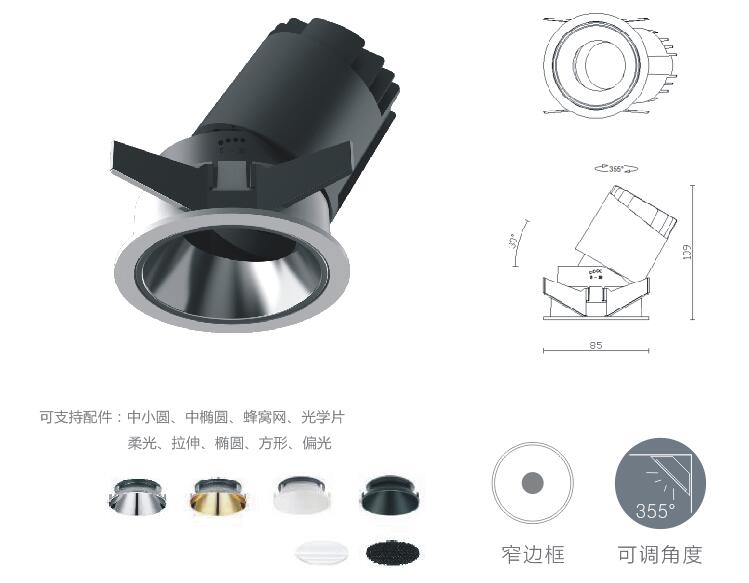 | GLX-HES1221 | 12W | CREE/CITIZEN | 3000/4000/6000K | 10°/24°/38° | Ra≥90 | Φ75mm | 嵌入式 |