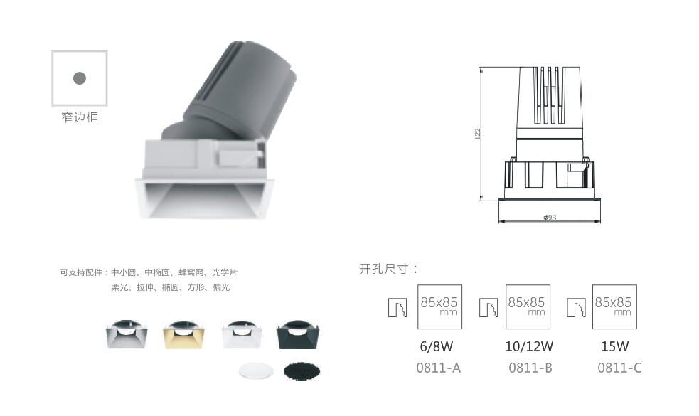 | GLP-HM0811-C | 15W | CREE/CITIZEN | 3000/4000K | 10°/24°/36° | Ra≥90 | 85*85mm | 嵌入式 |