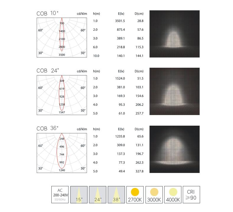 | 型号 | 功率 | 光源 | 色温 | 光束角 | 显指 | 开孔 | 安装方式 |
