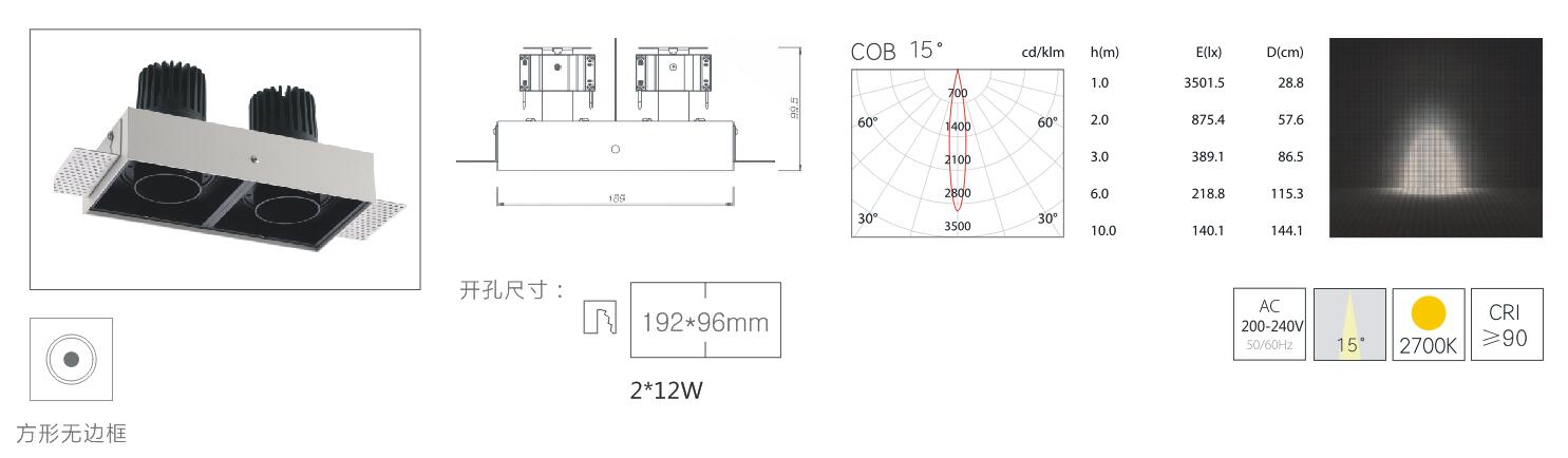 | GLP-HM2410 | 2*12W | CREE/CITIZEN | 2700K | 15° | Ra≥90 | 192*96mm | 嵌入式 |