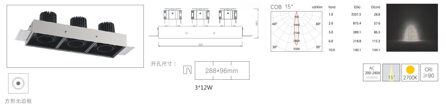 | GLP-HM3610 | 3*12W | CREE/CITIZEN | 2700K | 15° | Ra≥90 | 288*96mm | 嵌入式 |