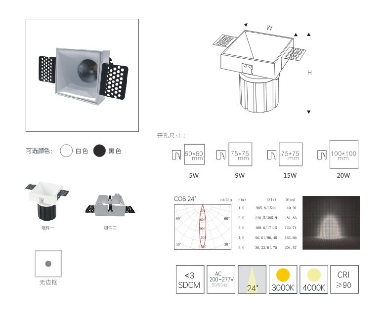 | 型号 | 功率 | 光源 | 色温 | 光束角 | 显指 | 开孔 | 安装方式 |