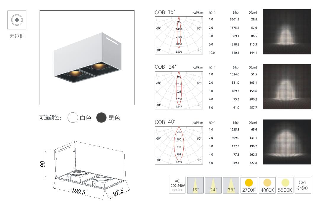 | GLT-HM-M2001 | 2*10W | CREE/CITIZEN | 2700-5500K | 15°/24°/40° | Ra≥90 | 190*97*90mm | 明装式 |
