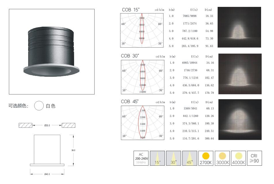 | GLX-BD0235 | 2W | CREE/CITIZEN | 2700/3000/4000K | 15°/30°/45° | Ra≥90 | Φ35mm | 嵌入式 |
