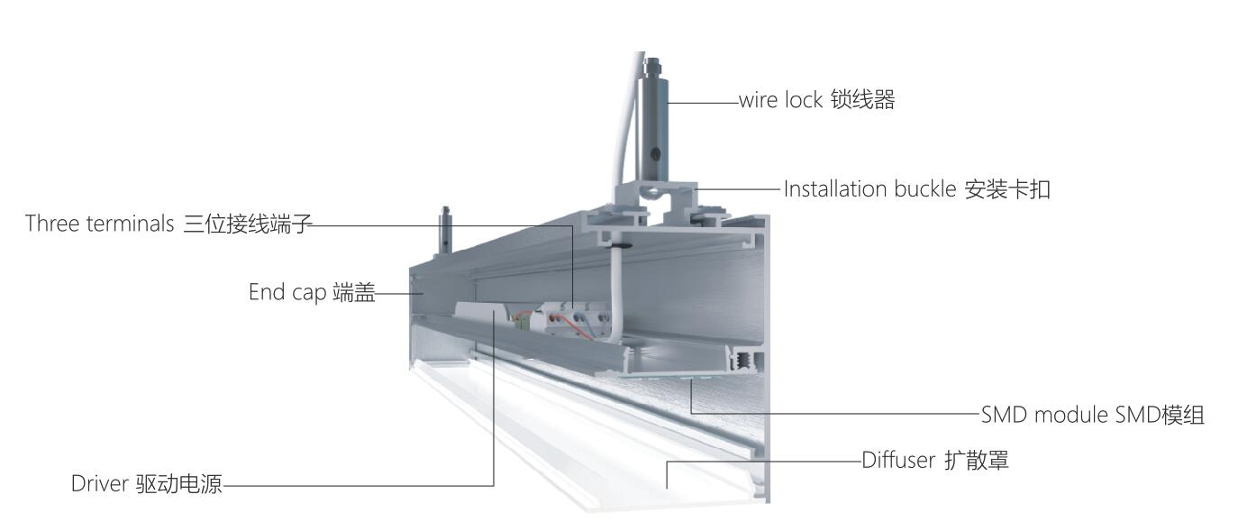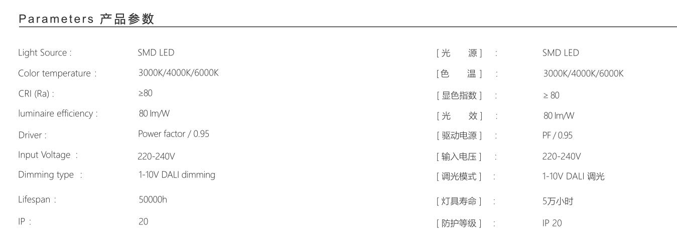 内置高亮度SMD光源,光效可达120LM/W,高转换率的驱动电源;具有短路、过载、过压等保护措施;另可选配调光电源(1-10VDALI调光);